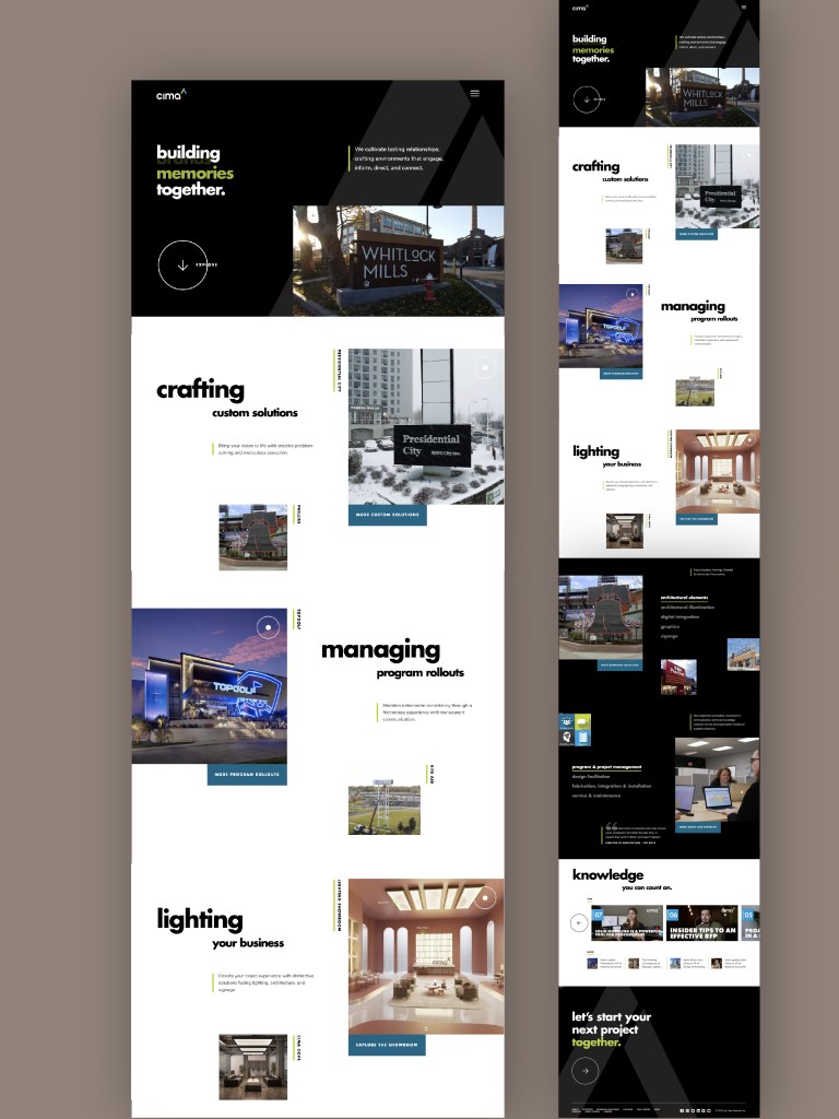 Cima has aggressive growth goals and needs a website that reflects their future vision. As the art director on this project I led a team of web developers and a content creator through strategy and implementation. I kicked off the project with clear goals, a customer journey map, site map, and wire framing. Then led meetings, twice a week, to guide development and content direction. I, then, created (15) case studies highlighting Cima’s range of products, projects and programs. View it Live!